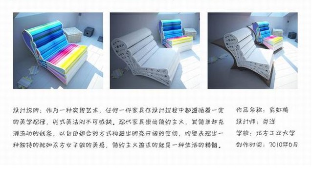 由北京理工大学、北京航空航天大学、北京科技大学、北京林业大学、中央民族大学、北京师范大学、北京化工大学、北方工业大学八所高校共同参与,举办的“幸福穿越设计”——2011年设计类高校研究生作品展已经于5月23日开幕。作品涵盖工业设计、环境艺术、视觉传达设计三个领域。