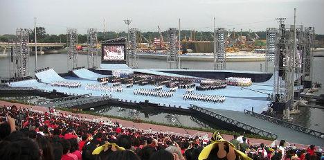 新加坡滨海湾的浮动体育场是世界上最大的漂浮舞台——滨海湾浮动舞台,可承受9000人、200吨舞台道具和3辆300吨军车的重量。这只是一个平台,邻近的看台可容纳3万名观众。滨海湾浮动舞台漂浮在新加坡滨海湾水库的水面之上,不仅可用于举办比赛,同时也可用于举行音乐会、展览会、文化艺术表演以及国庆节阅兵。