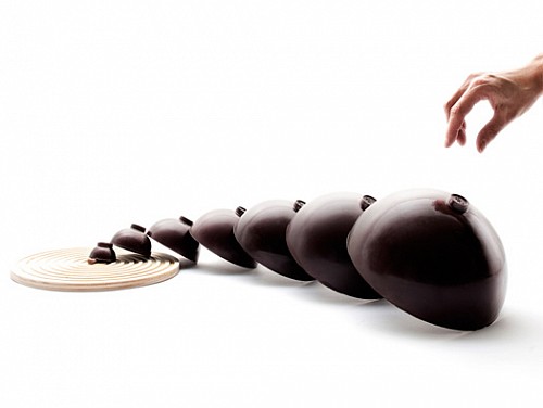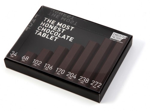 巧克力有什么好设计的呢,除了食用以外5.5 Designers还为我们增加了许多有趣的想法在里面。Gateau巧克力是一个切开的蛋糕一样,每一块都是一种口味,虽然模具只有3种,但是味道可以任意组合;The Most Honest Chocolate Tablet ,最诚实的巧克力,在包装上清楚地注明每件中含有有多少卡路里;bowls,碗形巧克力,一层一层的指引你走向它们的心脏——一粒可可豆。